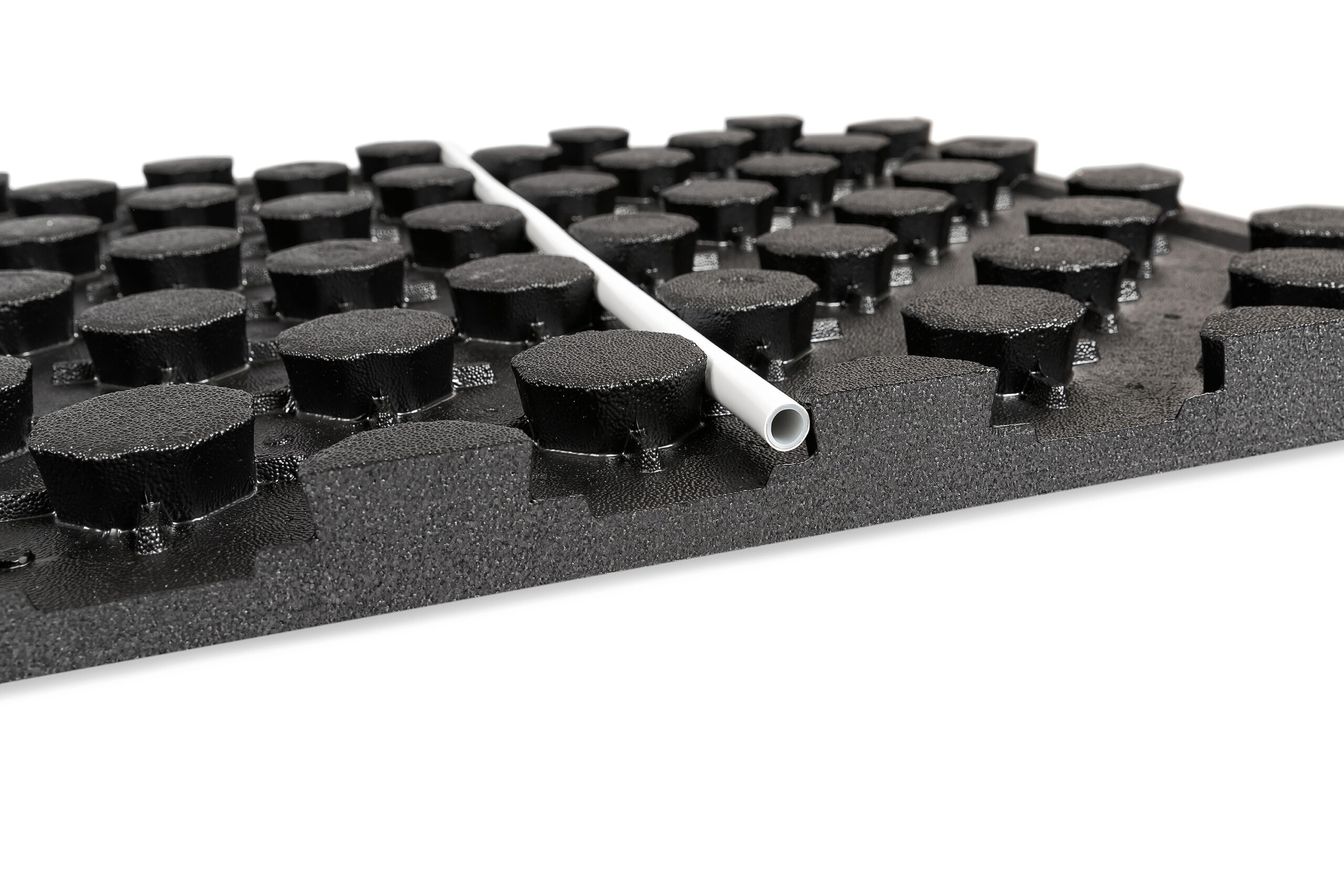 Placa de Aislante termoacústico de Poliestireno Expandido GRAFITO, elastificado (EPPS) y plastificada, para suelo radiante, de superficie moldeada y laterales machihembrados. Cada placa de Poliradiante tiene un acabado machihembrado a cuatro cantos, que permite colocarlas de forma sencilla y que evite los puentes térmicos. Mientras que el diseño troncocónico de los tetones, facilita que las tuberías queden sujetas de una forma rápida y eficaz, sin necesidad de usar grapas ni otro tipo de complementos.
