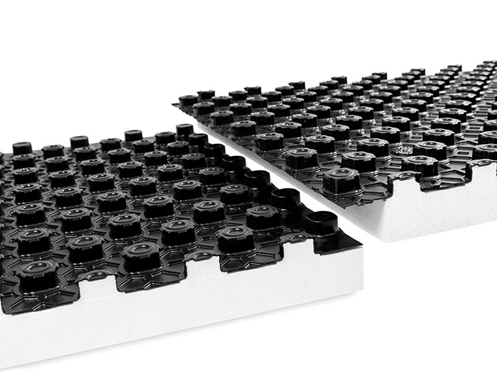 Las placas cuentan con acabado machihembrado por encastre a cuatro cantos, que permiten una colocación sencilla, evitando puentes térmicos. Mientras que el diseño de sus tetones mantiene las tuberías bien sujetas sin necesidad de grapas u otros complementos.